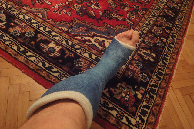 Weil der Scotchcast zu locker war, und keine richtige Zehenplatte hatte, wurde wieder ein klassischer Weißgips, verstärkt mit Scotchcast, angelegt. Der Gips soll in Summe 6 Wochen bleiben. Dieser Gips wurde unten mit einer grünen Scotchbinde verstärkt. Um den Gips gut aushärten zu lassen, habe ich 3 Stunden gewartet, bevor ich die Ambulanz auf Krücken verlassen habe. Danach habe ich noch weitere 2h entlastet. ... Link (0 Kommentare) ... Comment Samstag, 17. November 2012
